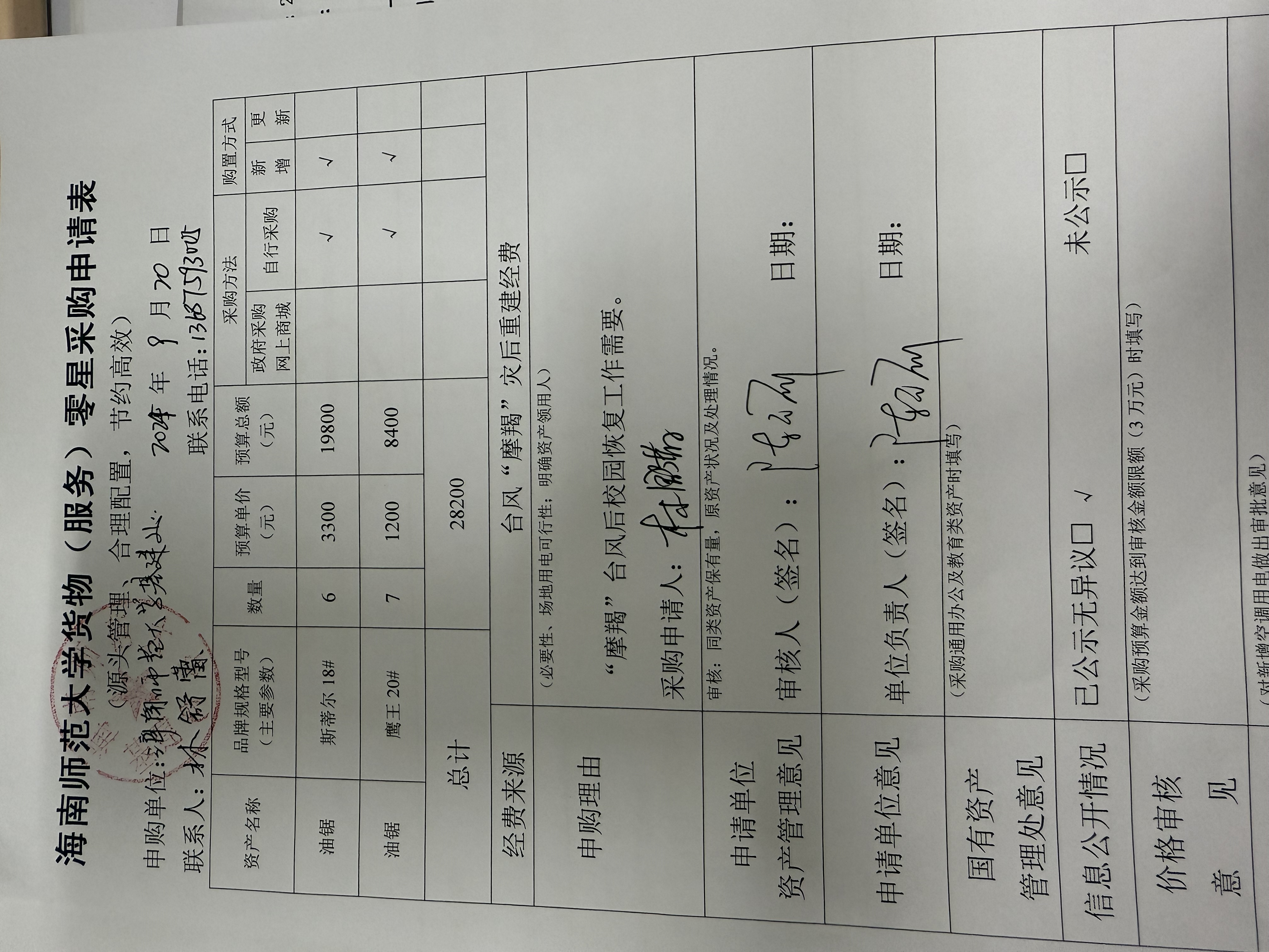 2024年“摩羯”台风灾后校园恢复工作需购买油锯。